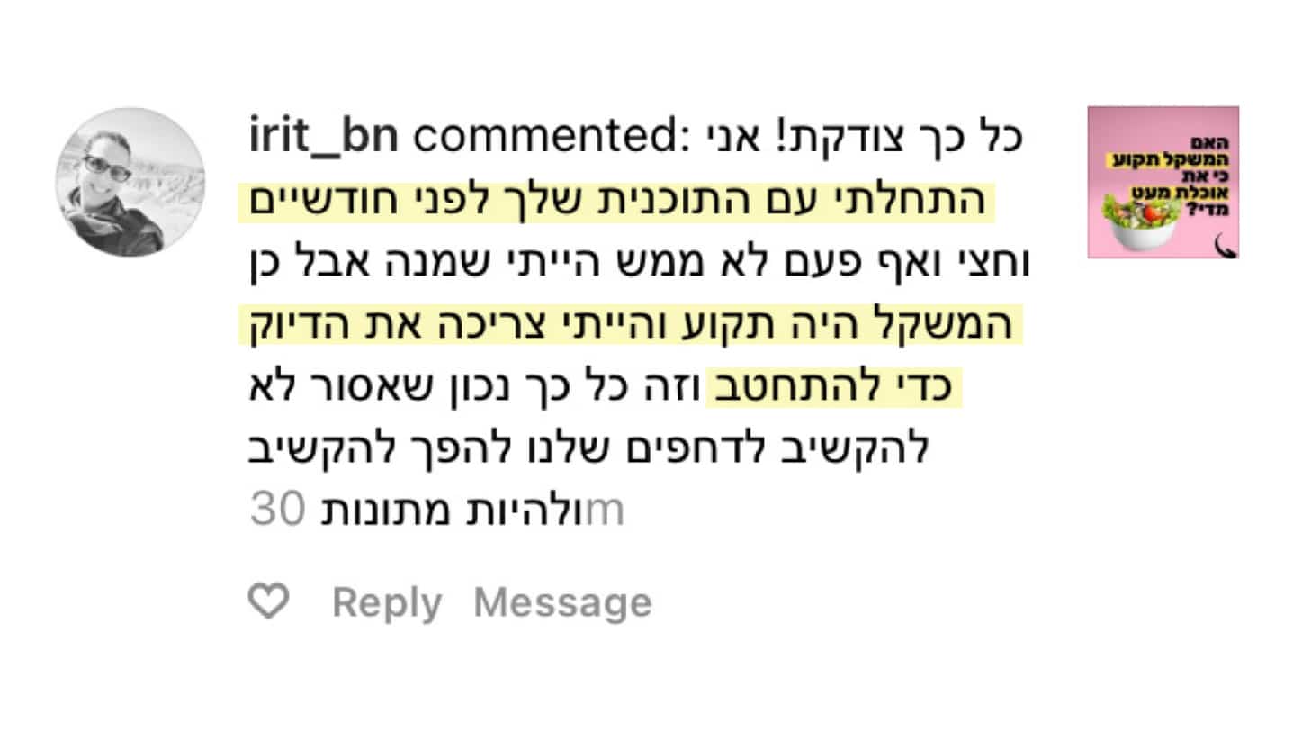 בניגוד ליועצים שניתלים על מגבלות כמו לצום לסירוגין או להחליף ארוחות באבקות, אני מלמדת איך ליישם את העקרונות הכי חשובים לירידה במשקל דרך ארוחות שגרתיות והמון גמישות. אני מוכיחה שאפשר גם להינות מאוכל וגם לתחזק גוף חטוב בלי להילחם ברעב וחשקים.
