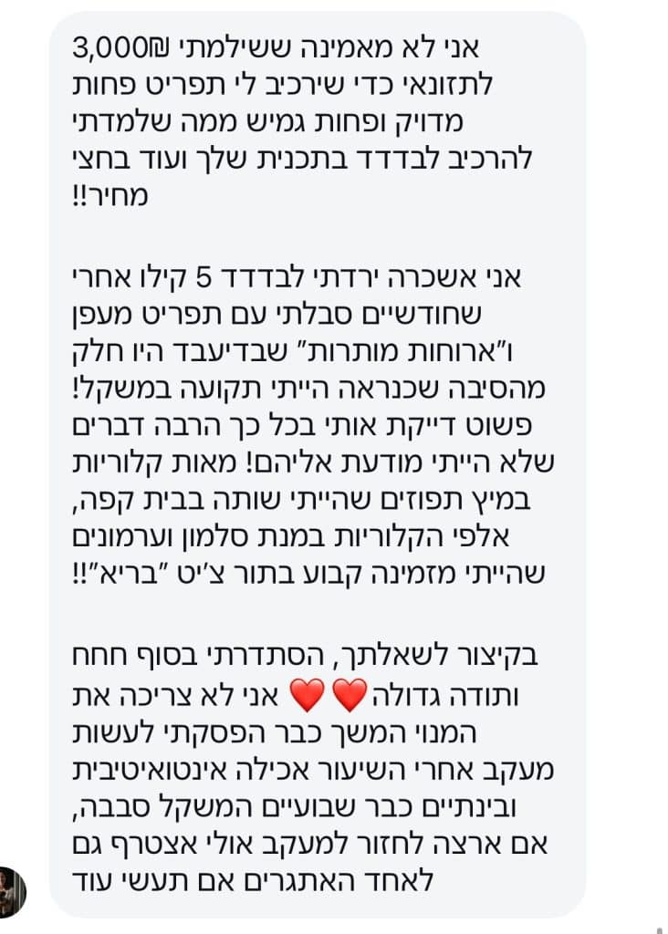 בניגוד ליועצים שממציאים “שיטות” כמו לצום לסירוגין או להחליף ארוחות באבקות, אני מלמדת איך ליישם את העקרונות נחוצים לירידה במשקל דרך ארוחות שגרתיות.