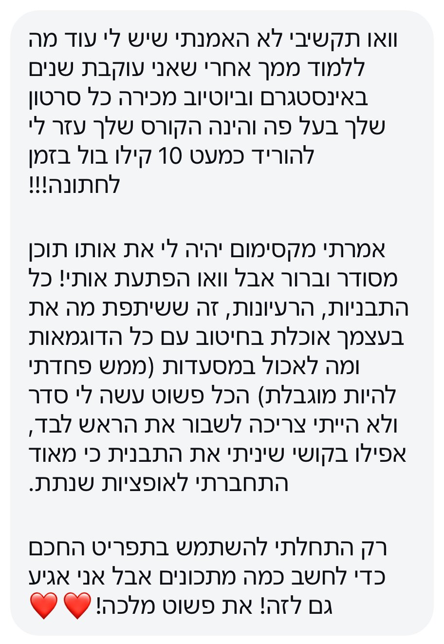 "לא ספרתי קלוריות לרגע. השתמשתי בידע ובתבנית הבסיסית להתחלה ומשם יכלתי להמשיך אינטואיטיבית"