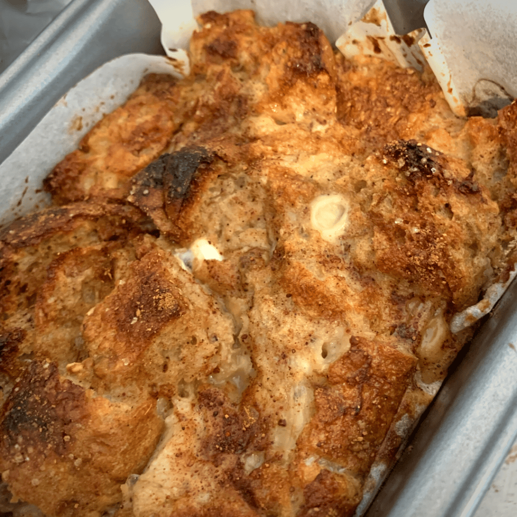 - לחתוך את הלחמניות לקוביות ולהכניס לתבנית אינגלנד קייר מכוסה בנייר אפייה
