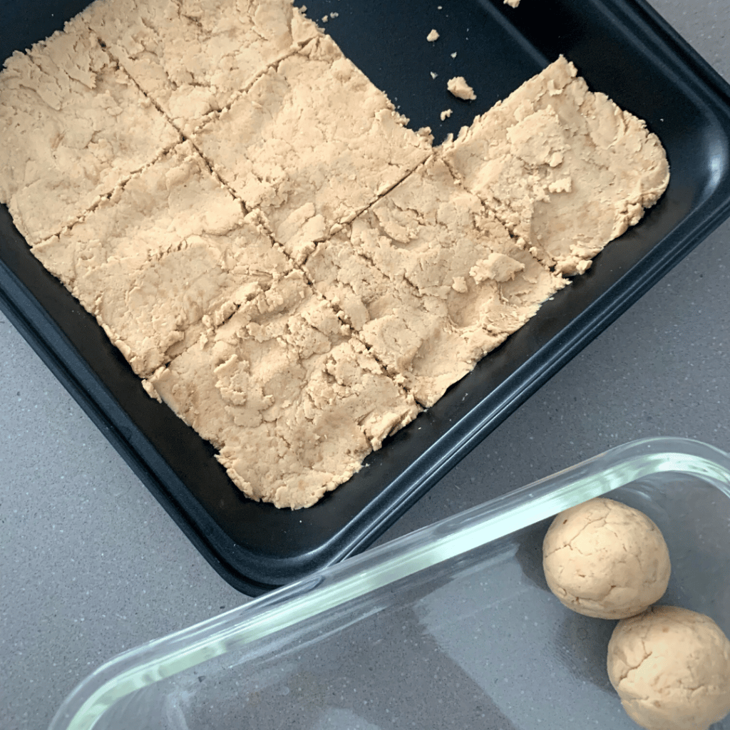 כעת יש לחתוך ל-9 ריבועים, ולהוציא כל יחידה בזהירות ולגלגל אותה לכדור.