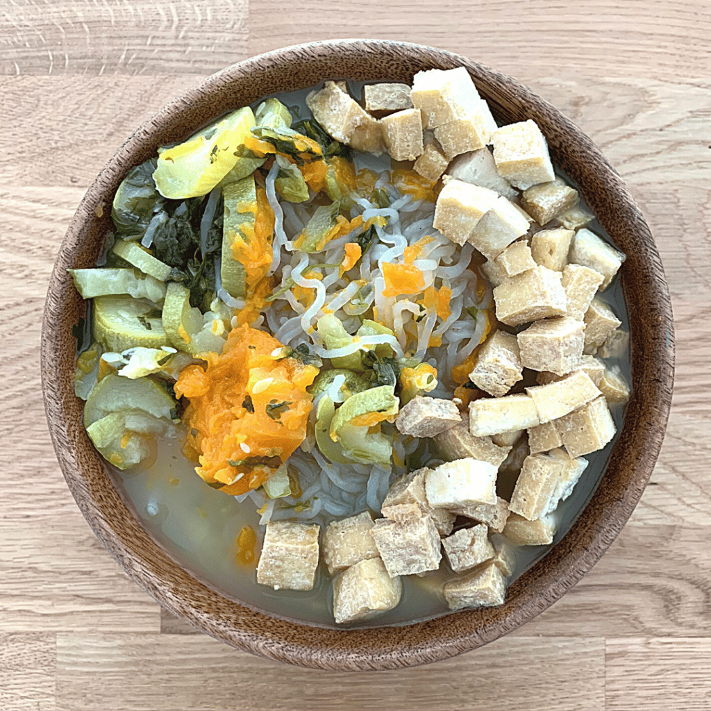 - את הסקיני פסטה יש לשטוף ואז להוסיף למרק כאשר הוא מתבשל ואת הטופו בסוף להוסיף מעל המרק כאשר הוא מעט קריספי מבחוץ.