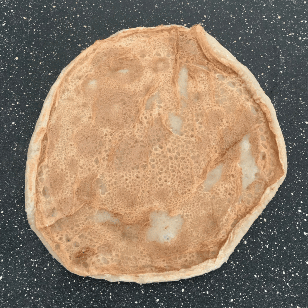 - לערבב את כל המצרכים של הבלילה ולשפוך חצי בלילה על מחבת נונסטיק חם – כמה שיותר לפזר ולהפוך ברגע שיש בועות.